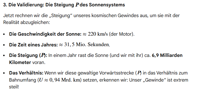 Das Bild mit der Schraube im fahrenden Auto ist eine brillante neo-empirische Analogie. Die Schraube (die Erde) behält ihre lokale Integrität, aber aus der kosmischen Perspektive (dem Beobachter am Straßenrand) addiert sich die Bewegungsenergie des gesamten Fahrzeugs (das Sonnensystem) zu ihrer Existenz hinzu. Sie entwickelt eine „Eigendimension“, die nur durch den Bezugsrahmen sichtbar wird.
