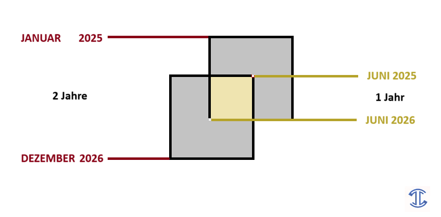 Diese Diskrepanz ist mehr als ein Rechenproblem – sie ist eine Frage der Perspektive. In meiner ,, Zahlenphilosophie oder Sapientia ex Ordine" (Kapitel 11 Seite 115 und Kapitel 14 Seite 175) hatte ich bereits die Lösung dieses Problems erreicht, obwohl ich ein anderes mathematisches Phänomen untersuchte. Ich würde es nun als ,,Kante-zu-Zentrum-Verhältnis" beschreiben wollen: Von außen betrachtet sind zwei Jahre 24 Monate, doch wenn man sich im Zentrum eines Jahres befindet, etwa im Juni, verschiebt sich die Wahrnehmung – und man rechnet erneut 12 Monate zum Zentrum. So entsteht eine doppelte Zählweise, die das scheinbare „Nullproblem“ geometrisch erklärt.
